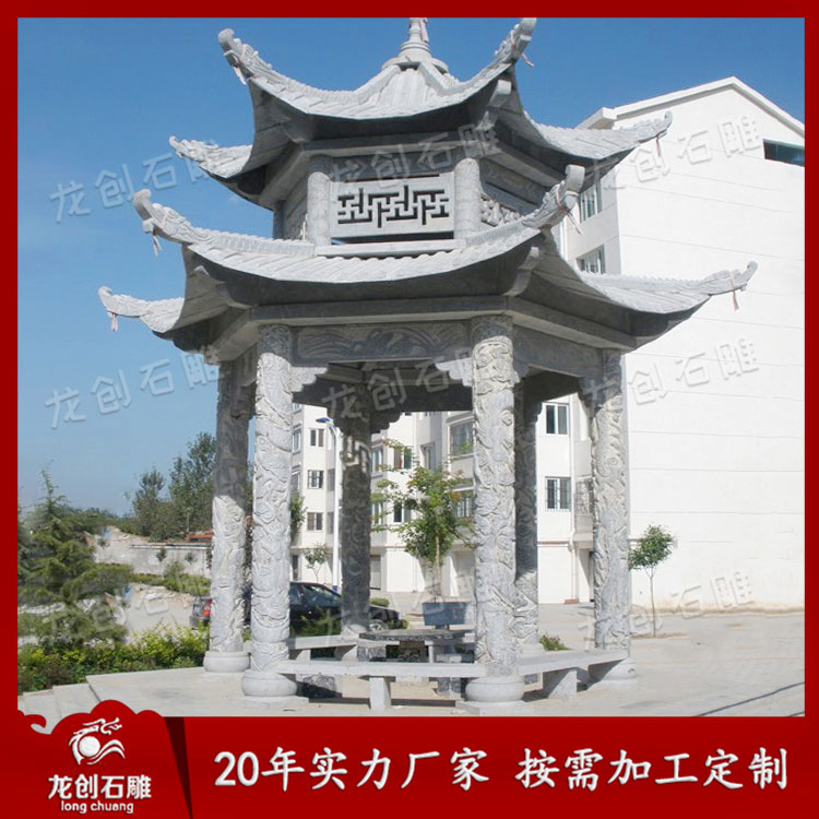 石雕雙層涼亭作為一種景觀建筑,經常的與空間環境作為主題形式出現。這樣我們可以從各個角度欣賞。但是它又不是一個實體,更多地強調其虛空的內部與周圍的空間環境之間的聯系,這樣就通過建筑造型的外在形象,在周圍空間中起到點睛的作用。它追求的是一種整體美、自然美、古典美。