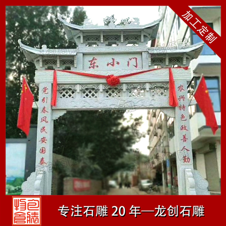 如果村莊的路口很大,也可以選用五門石雕牌坊和七門石雕牌坊樣式,這兩種樣式比較少見,這兩種大型的石雕牌坊建設是很壯觀,但是石材用量很大,造價成本高,因此只有經濟允許的情況下選擇。